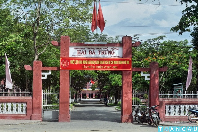 Trường Hai Bà Trưng nằm ngay cạnh trường Quốc học, trước đây được biết đến với tên gọi là trường nữ trung học Đồng Khánh. Ngôi trường được xây dựng năm 1917 và hoàn thành sau 2 năm. Trường Hai Bà Trưng cũng có một kiểu kiến trúc giống với trường Quốc học, có lớp sơn tường màu hồng thắm và một khuôn viên rộng rãi. Với vẻ đẹp đặc trưng, trường Hai Bà Trưng cũng là một điểm check-in tuyệt vời mà bạn không nên bỏ qua.